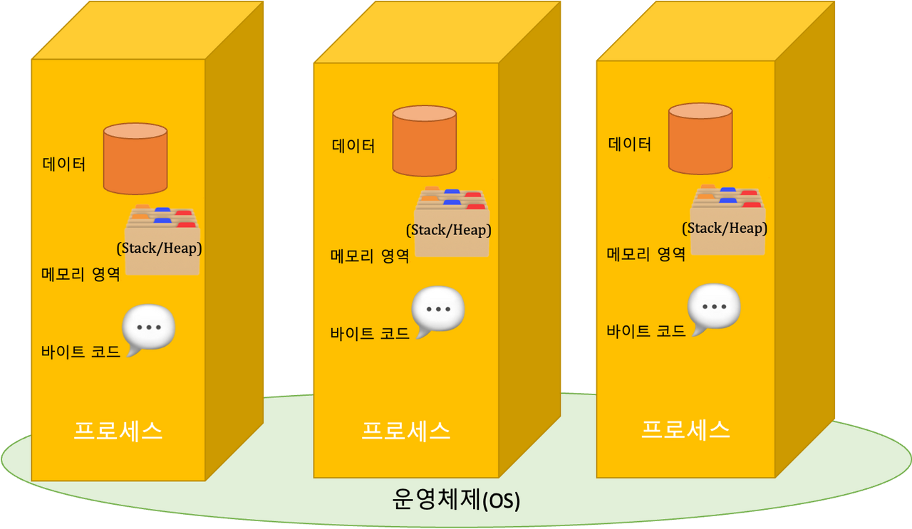 프로세스와 쓰레드 프로세스 : 운영체제로부터 자원을 할당받는 작업의 단위, 실행 중인 프로그램을 의미 쓰레드 : 프로세스가 할당받은 자원을 이용하는 실행의 단위, 프로세스내에서 일하는 일꾼(코드실행의 흐름) OS가 프로그램 실행을 위한 프로세스를 할당해줄때 프로세스안에 프로그램 Code와 Data 그리고 메모리 영역(Stack, Heap)을 함께 할당해준다. 프로세스가 작업중인 프로그램에서 실행요청이 들어오면 쓰레드(일꾼)을 만들어 명령을 처리하도록 한다. 프로세스 안에는 여러 쓰레드(일꾼)들이 있고, 쓰레드들은 실행을 위한 프로세스 내 주소공간이나 메모리공간(Heap)을 공유받는다. 추가로, 쓰레드(일꾼)들은 각각 명령처리를 위한 자신만의 메모리공간(Stack)도 할당받는다. Java는 이와 같이 JV..
